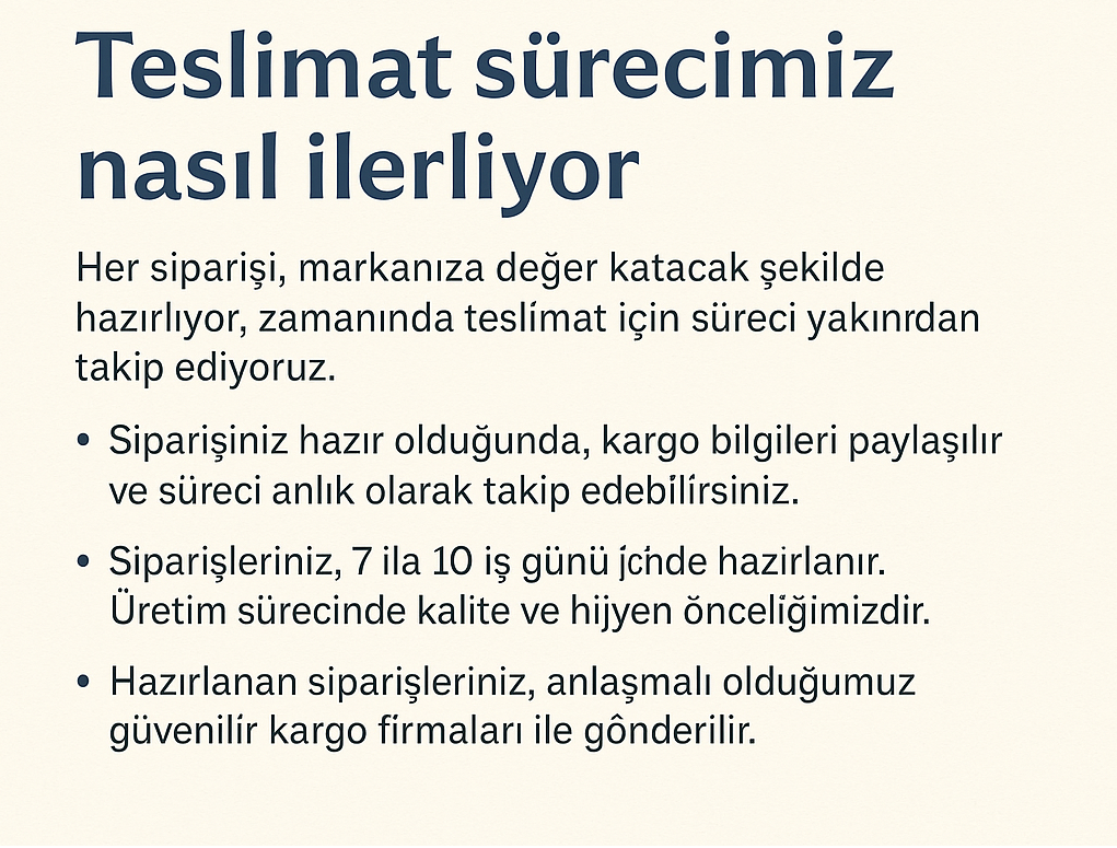 - Siparişleriniz, ürün özelliklerine göre 7 ila 10 iş günü içinde hazırlanır. Üretim sürecinde kalite, hijyen ve özen önceliğimizdir.