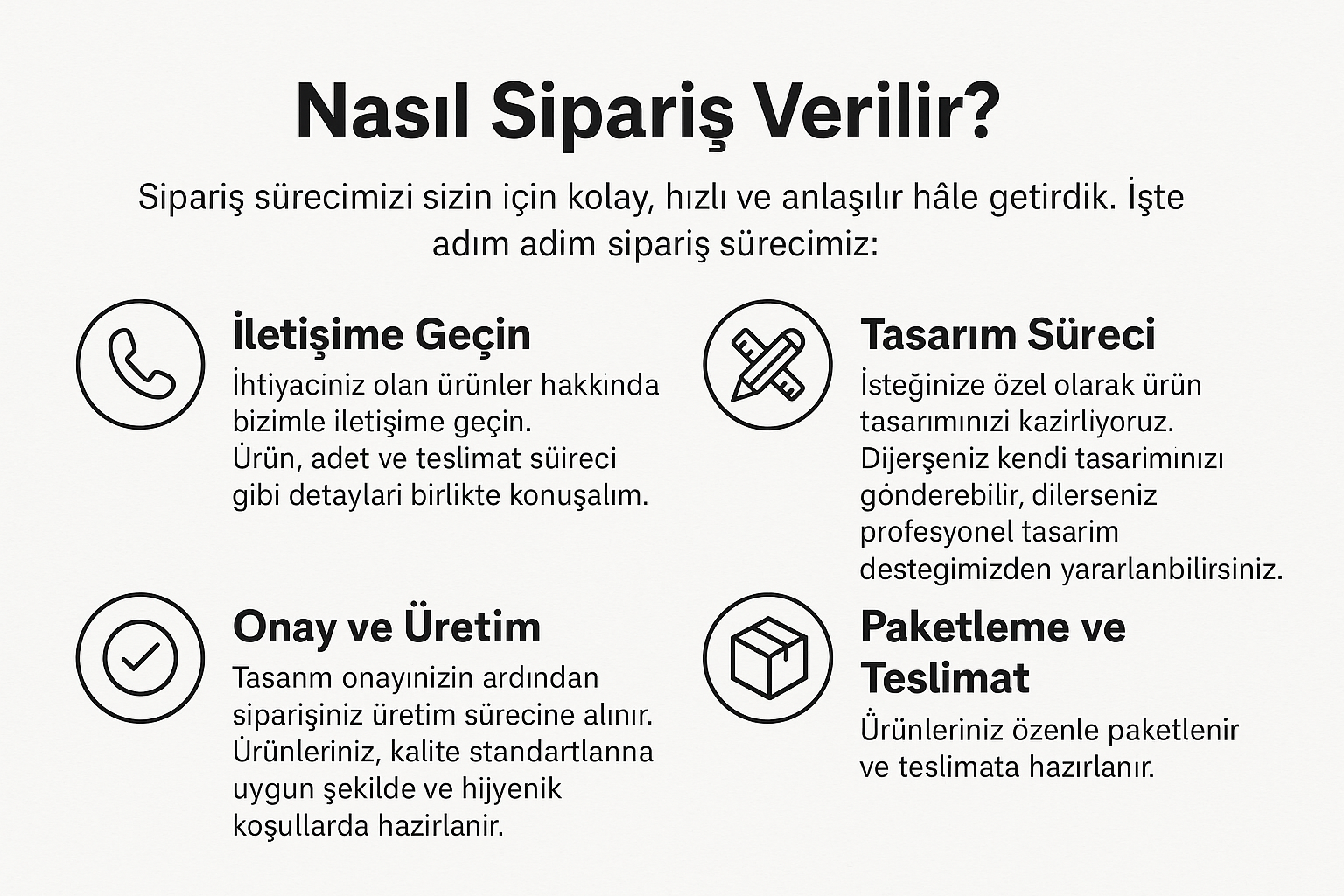 Her siparişi, markanıza değer katacak şekilde hazırlıyor, zamanında teslimat için süreci yakından takip ediyoruz.